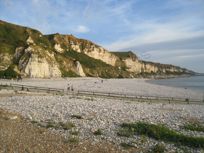 We naderen al snel het centrum waar mooie oude gevels te bewonderen zijn. Aan het pleintje zitten veel cafés en restaurantjes. We bekijken de gevels en maken foto’s. We lopen door een druk straatje naar het strand, trap op en ja hoor daar zien we dan links de ‘olifant’ of wel Falaise d’Aval.