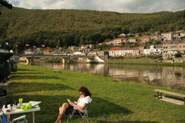 In Monthermé stoppen we voor onze eerste overnachting. We parkeren de camper en zien rook onder de motorkap vandaan komen. Oeps...wat is dat? Marc maakt de kap open en we zien dat alles nat is. Na enig onderzoek blijkt het koelvloeistof te zijn. We hebben helaas geen verstand van auto's. Marc weet nog wel dat de temperatuur van de motor de hele reis goed is geweest, het probleem is dus net ontstaan. Marc belt de garage in Nederland en vraagt om advies. We moeten rustig wachten tot alles afgekoeld is en dan opnieuw kijken. |