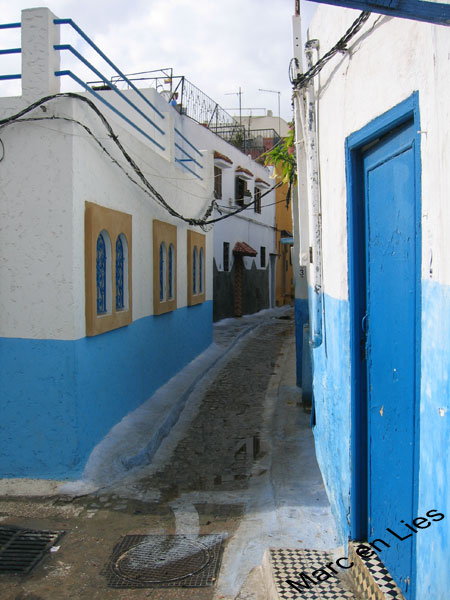 De bus zet ons af voor de poort van de kasba van Rabat. In de kasba wonen tegenwoordig veel artiesten en kunstenaars. De muren zijn wit/blauw geschilderd en de deuren zijn mooi onderhouden. Het geheel geeft een beetje een mediteriaans tintje. Je waant je zo in Griekenland (zeggen de kenners).