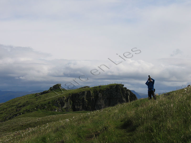 We komen aan bij de plaats waar we gisteren de papegaaiduikers hebben gezien, nu is er geen één te spotten. Op ons kaartje staat een rondwandeling maar ergens raken we het spoor bijster en lopen we door het sompige veen te zoeken naar het pad. Gelukkig vinden we het weer. De pad loopt op de terugweg door wat ruiger gebeid en is daardoor zwaarder.